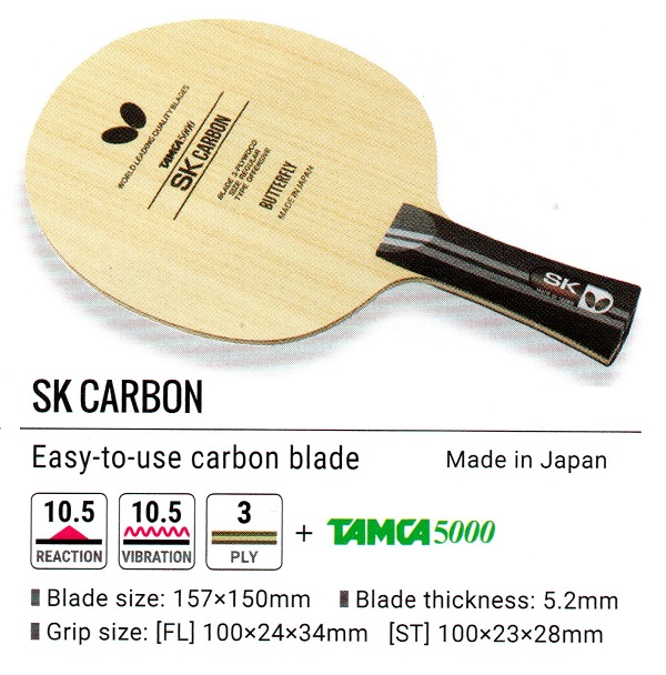 BUTTERFLY SK Carbon (Tamca 5000 Carbon) – Mango: FL – ST – Reacción: 10.5 – Vibración: 10.5 – Tipo de Juego: ataque – Peso: 78g