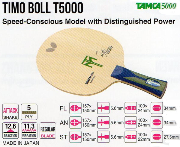 BUTTERFLY Timo Boll T5000 (Tamca 5000 Carbon) – Mango: FL – Reacción: 12.6 – Vibración: 11.3 – Tipo de Juego: ataque – Peso: 90g